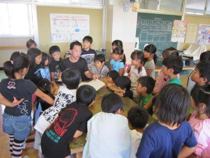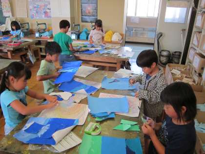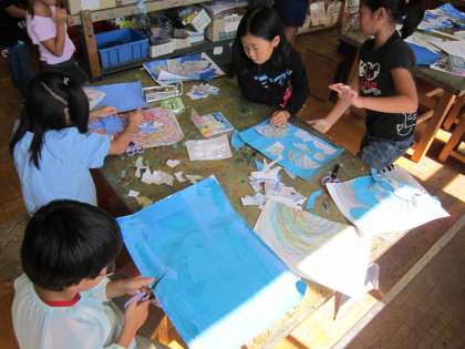 2年図画工作科「海と台風からカイブツだ」 今日は、描きあげた2つの絵を貼りあわせて作品を完成させました。おもしろい作品ができました。
