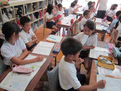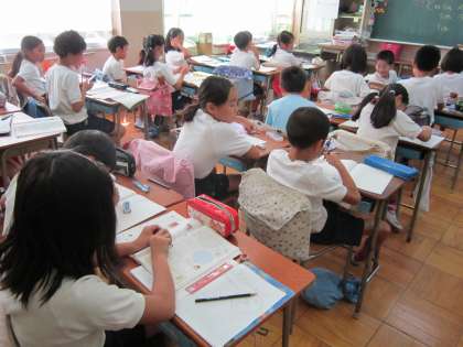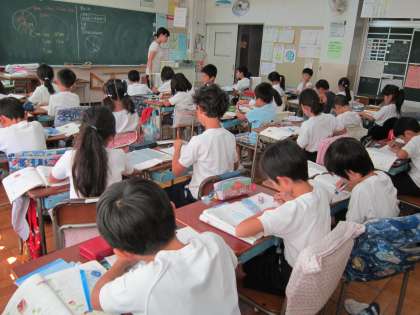 3年算数科「円と球」 円をかく学習です。中心、半径、直径の分からない円と同じ円をかくにはどうしたらよいか、考えて話し合っていました