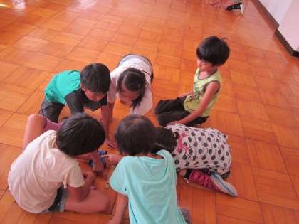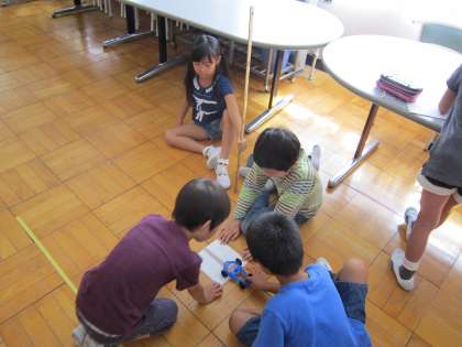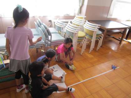 3年理科「風やゴムのはたらき」 ゴムを引っ張る長さと車の走る距離の関係を調べる実験をしていました。グループで協力して、一生懸命長さをはかっていました。