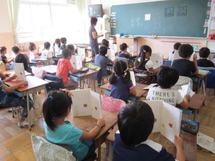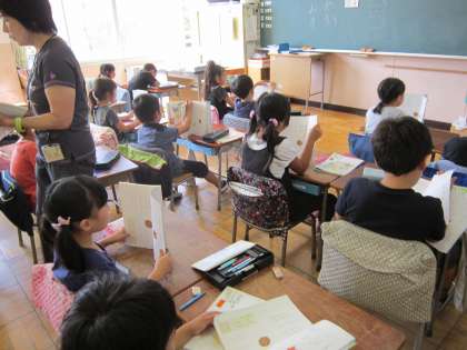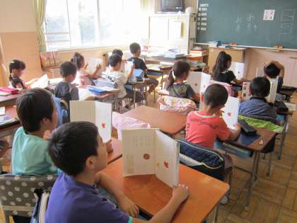 1年国語科「やまで じゃんけん」 詩の音読の授業です。こだまのことを知り、読み方を考えて音読していました。