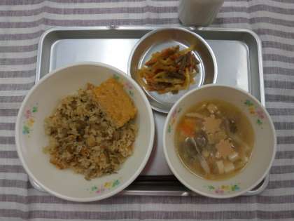 今日の汁物は「豆腐汁」です。まいたけやえのきたけ、にんじん、もみじかまぼこなどの入った具だくさんの汁物です。具だくさんの汁物は、栄養満点です。昔から「汁の実三種は体によい、汁の実五種は命によい」と言い伝えられてきました。給食の汁物は、いつもたくさんの具が入っていますね。残さず食べて、健康な体をつくりましょう。