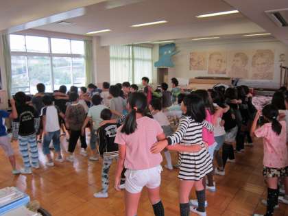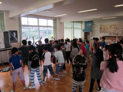 4年音楽科「追いかけようライオネル」 学芸会に向けて、4年生全員で、元気に歌いながら、踊って表現していました。