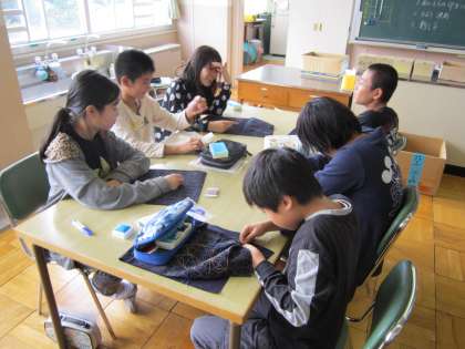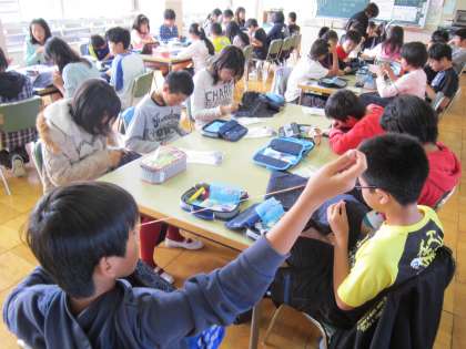 6年家庭科「思い出を形に、生活に役立つものを作ろう」 刺し子に夢中に取り組み、布製品の製作に励んでいます。