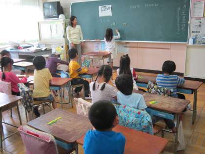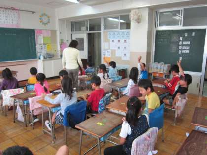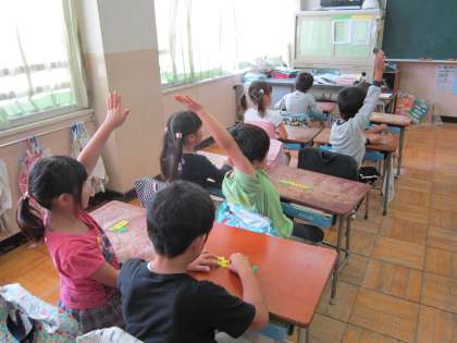 1年算数科「たし算」 くり上がりの学習の授業です。おはじきを使って、9+4の計算の仕方を、話し合いながら学習していました。