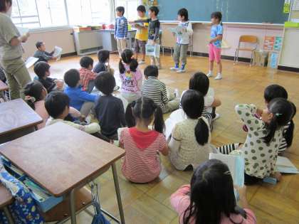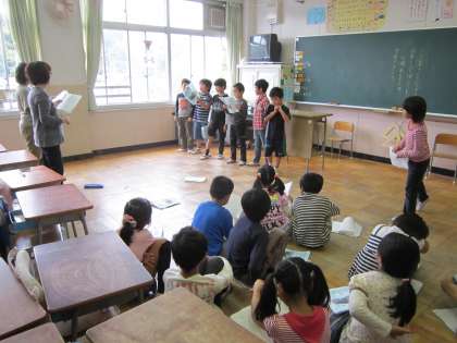 2年 学芸会の練習です。台本の読み合わせに、動きがついてきました。元気に大きな声で台詞が言えていました。