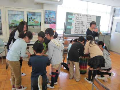 5年音楽科「メスライオンの歌」 ライオンキングの曲の合奏にいろいろな太鼓を使います。今日は、全員が太鼓に触れ、たたいてみました。連合音楽会が楽しみです。