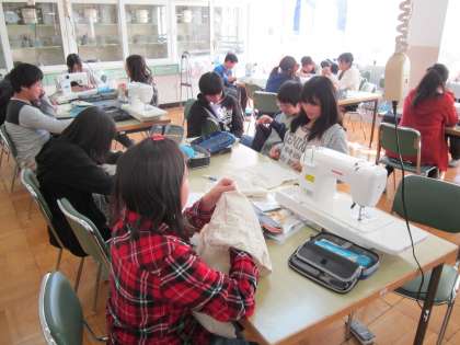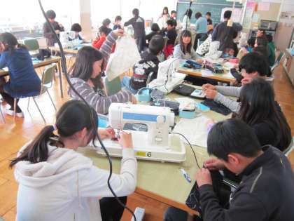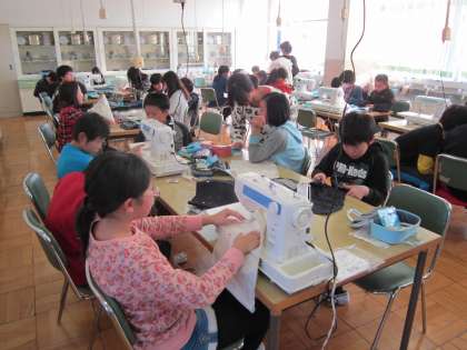 6年家庭科「思い出を形に」 刺し子の袋作りも完成に近づいてきました。