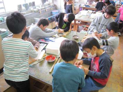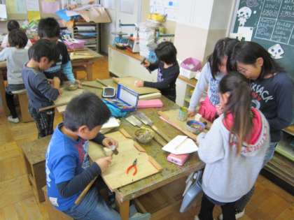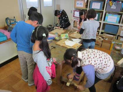 2年生・4年生図画工作科「木のようせい」 4年生と2年生の合同の授業です。のこぎり。かなづち、くぎの使い方を4年生が2年生にやさしく丁寧に指導していました。