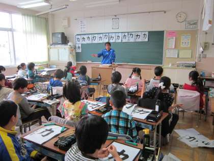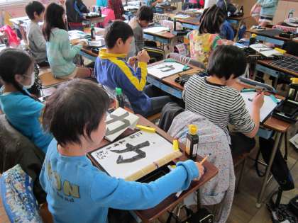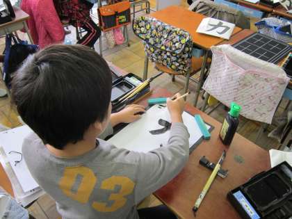 3年生国語科「書写」 「力」という字を毛筆で一生懸命練習していました。