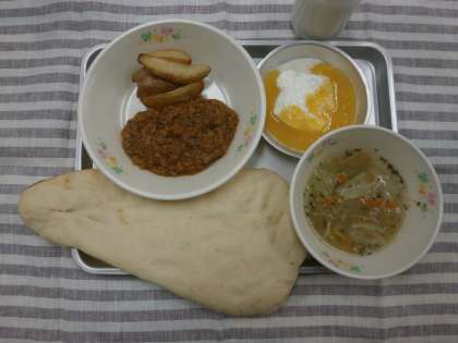 今日のパンは「ナン」といいます。みんなからのリクエストがとても多いパンのひとつで、一年生のリクエスト献立でも上位に入っていましたね。ナンは、インド辺りの国で、よく食べられているパンです。平たくて、ぞうりのような形をしているのが特ちょうです。今日はキーマカレーをつけて食べます。”キーマ”とは、ひき肉という意味です。インドでは、ヤギやトリの肉を使うことが多いそうですよ。ちぎったナンに、キーマカレーをたっぷりつけて食べましょう。