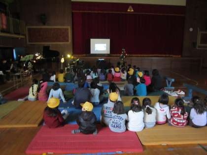 今日の放課後子供教室では、PTAお話レストランと連携して、読み聞かせをしました。映像やピアノやフルートなどの音響もある本格的な「スノーマン」の読み聞かせに、子供たちは聞き入っていました。