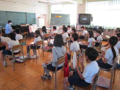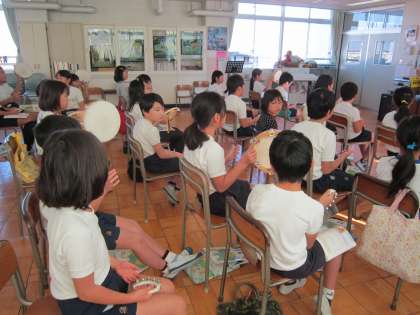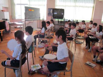 4年音楽科「冬の歌」 曲の感じを生かして、タンバリンとすずで演奏をします。音符によるリズムの違いを感じながら、楽しく演奏していました。