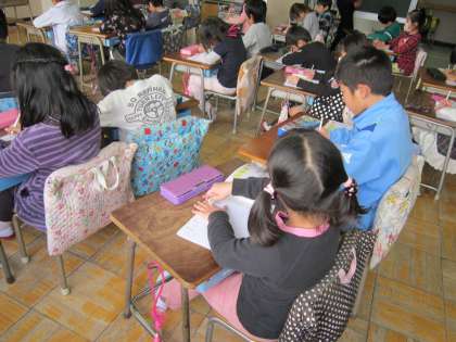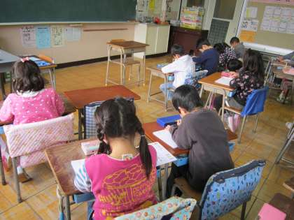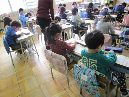 1年国語科 漢字の書き取りの練習をしていました。よい姿勢で、書き順や字配りに気を付けて丁寧に書いていました。