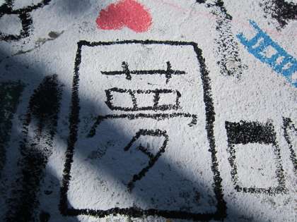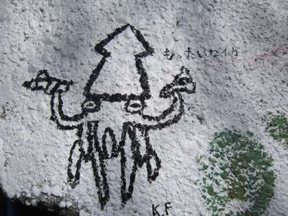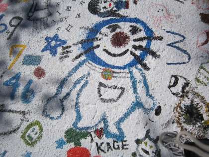 6年図画工作科「卒業制作」 校庭の石舞台ステージに6年生全員で絵をかきました。一人一人気持ちを込めて筆を走らせていました。ドラえもんや長沼小もったいない運動のキャラクター「もったいなイカ」も登場しました。