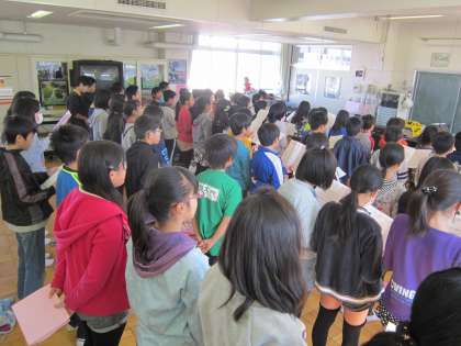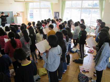 5年音楽科「ふるさと」 嵐が歌っている東日本大震災の応援曲でもある「ふるさと」です。今日、3月11日、震災3年目のこの日に、歌詞や曲に込められた思いの指導を受け、子供たちは気持ちを込めて歌っていました。