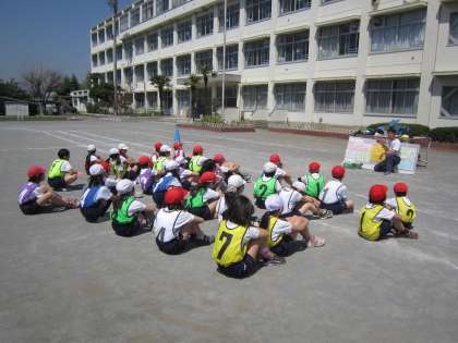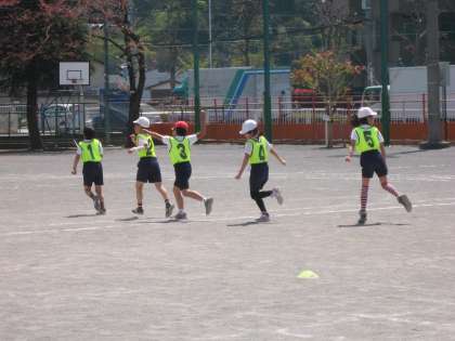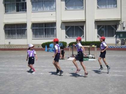 4年体育科「かけっこ・リレー」 主運動に入る前に、まねっこジョギングで体ほぐしです。」