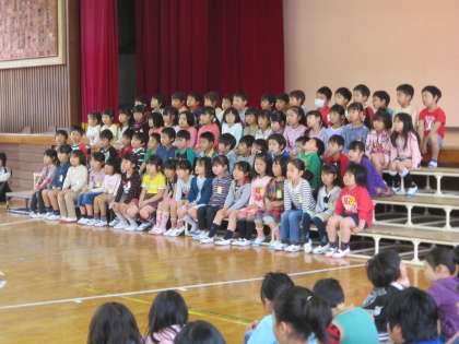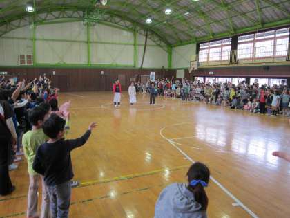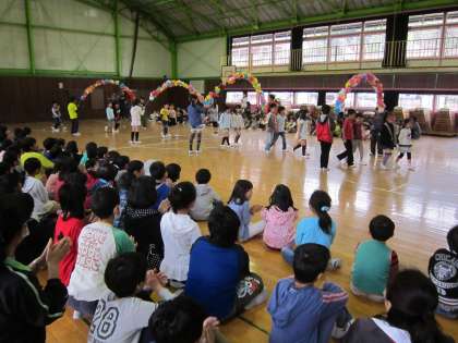 今日は、1年生を迎える会をしました。ゲーム、歌、プレゼントで楽しく過ごし、最後は上級生に乗って、かわいらしくにこにこ笑顔で退場しました。