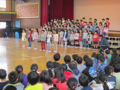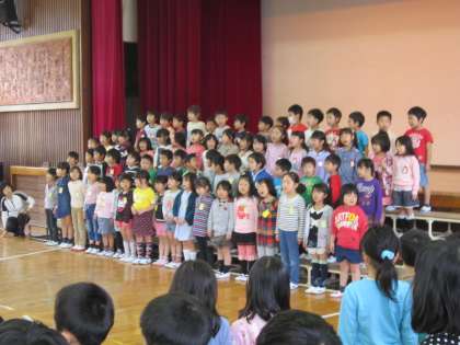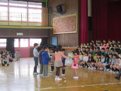 今日は、1年生を迎える会をしました。ゲーム、歌、プレゼントで楽しく過ごし、最後は上級生に乗って、かわいらしくにこにこ笑顔で退場しました。