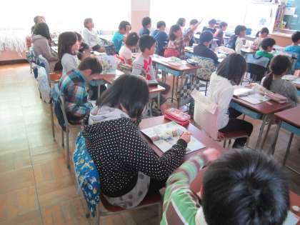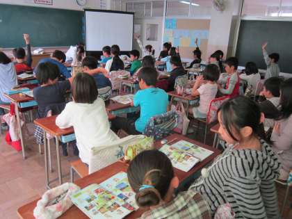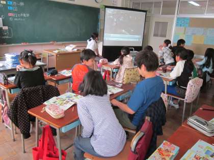 5年外国語活動「Hello」 世界のいろいろな国々のあいさつを、映像を見ながらクイズ形式で学習していました。
