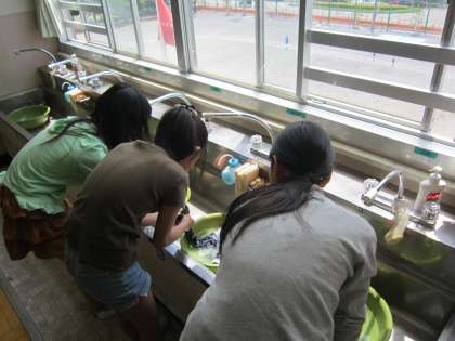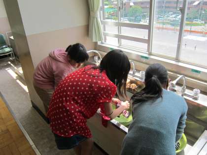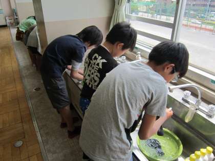 6年家庭科「工夫しようさわやかな生活」 手洗いの洗濯の実習です。洗う、しぼる、すすぐ、しぼるの手順で、一生懸命靴下を洗っていました。
