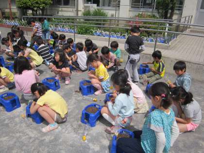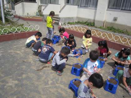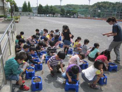 1年生活科「はながうたうよ るんらららん」 あさがおの種をまきました。水まきを続けて、成長を観察していきます。