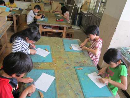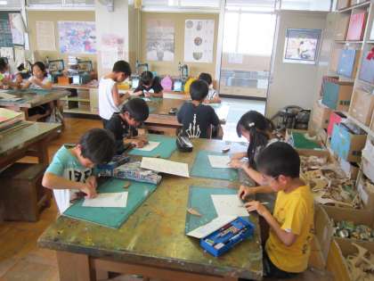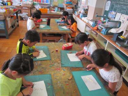 4年図画工作科「フィンガーペイント」 先週塗った粘土の下絵に、指で絵を描いていきます。絵をかく前に小刀で鉛筆削りをしていました。上手に小刀を使っています。