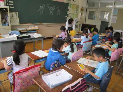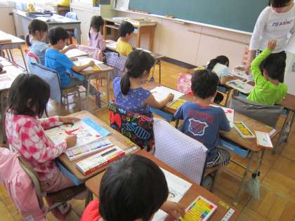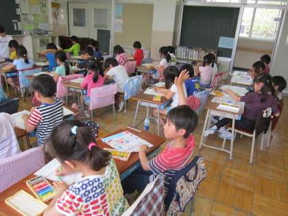 1年学級活動「運動会に向けて」 運動会で飾る旗づくりです。玉入れ、徒競走、ダンスを想像して、クレヨンで楽しく絵を描いていました。