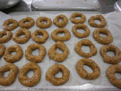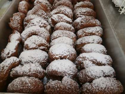 画像1は揚げる前のドーナッツ・2は揚げて粉砂糖をかけたドーナッツです