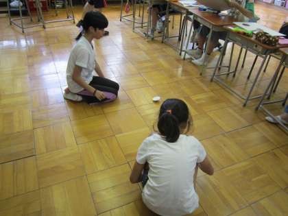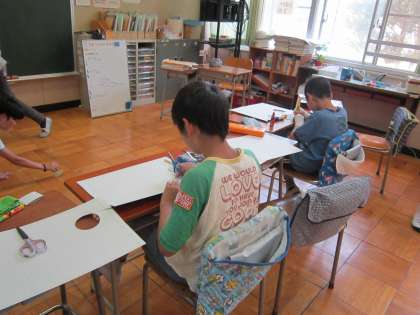 ひまわり学級算数科「円」 工作用紙を使って、自作のコンパスで円を描き、切り抜いてオリジナルのコマを作りました。