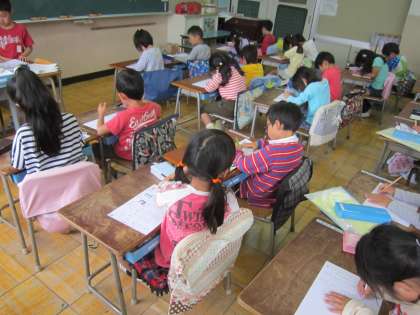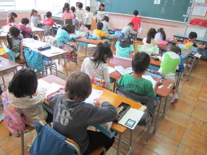 1年国語科「ひらがな」 「ま」の書き方の授業です。丁寧に一字一字練習していました。
