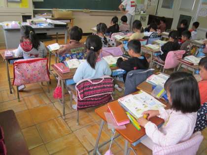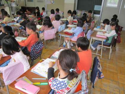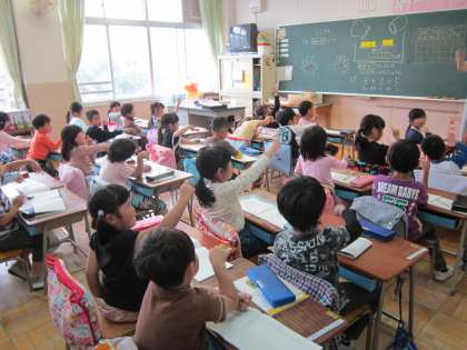 1年算数科「あわせていくつ」 たし算の授業です。ブロックを使って「あわせる」操作活動をしてから、ノートに初めて式を書きました。+=の書き方と読み方も初めて知りました。