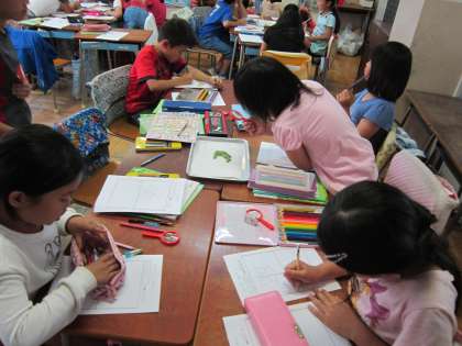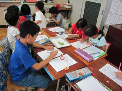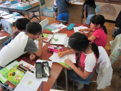 3年総合的な学習の時間「蚕を育てよう」 まだまだ小さいカイコを虫眼鏡で観察し、カードにまとめていました。