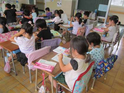 1年算数科「たし算」 9までのたし算の小テストをしていました。集中した取り組みに2か月の成長を感じます。