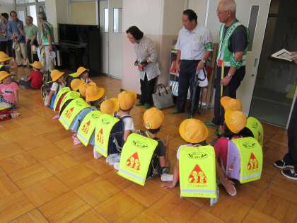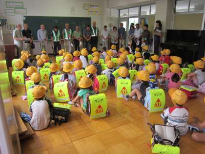 今日から地域学校安全ボランティアの方々が、毎週火曜日に1年生の下校の見守りをしてくださいます。今日は、顔合わせをして、方面ごとに集まって自己紹介をしました。