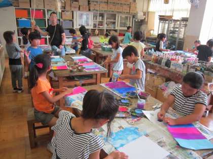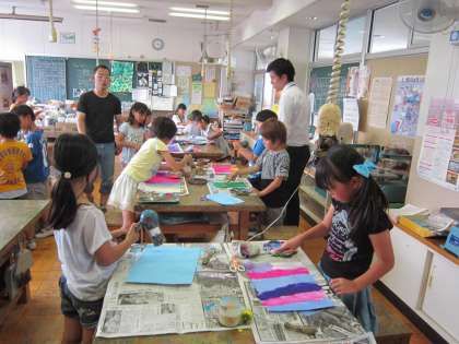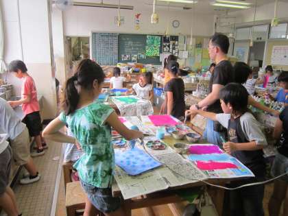 3年図画工作科「あじさい」 あじさいの葉っぱを描いて、ニューカラーで塗った花をつけていきます。楽しそうに活動していました。
