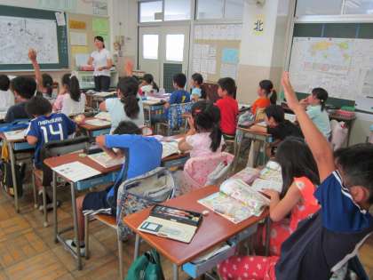 3年道徳「どうしてかな」 思いやり・親切がテーマの授業です。副読本の町の絵を見ながら、障害のある人のための施設や設備について、話し合っていました。