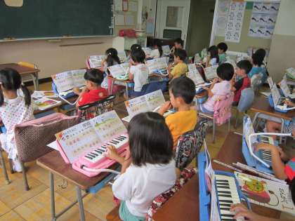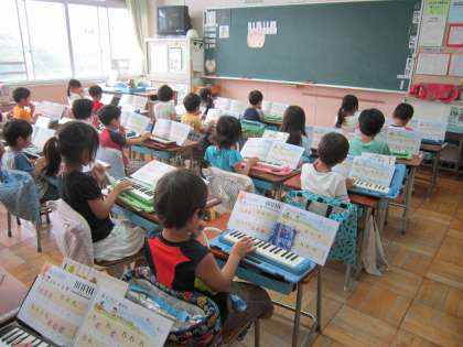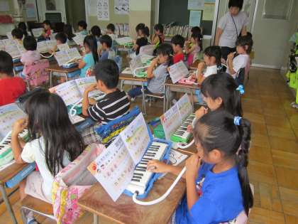 1年音楽科「あそぼ」 指使いを学習して、「ど」と「れ」の音で上手に演奏できました。