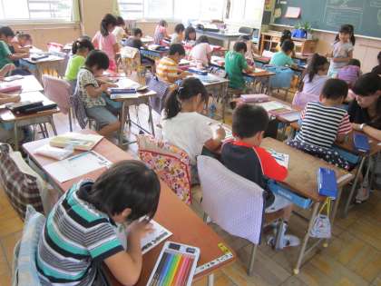 1年生活科「あさがお」 あさがおの観察をして、かたち、手ざわり、気づいたことについて話し合い、観察カードにまとめていました。