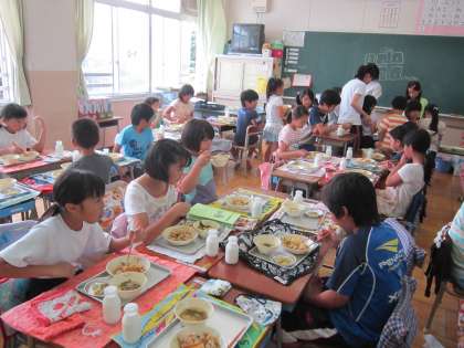 今日は、第1回のたてわり班給食です。少し緊張気味に自己紹介をして、美味しくいただきました。