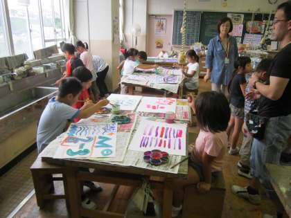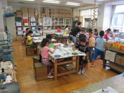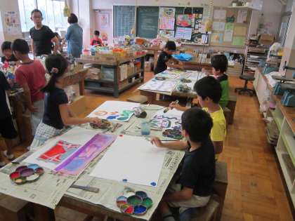 2年図画工作科「きれいだゾウ」 アクリル絵の具を初めて使い、重ね塗りを楽しんでいました。