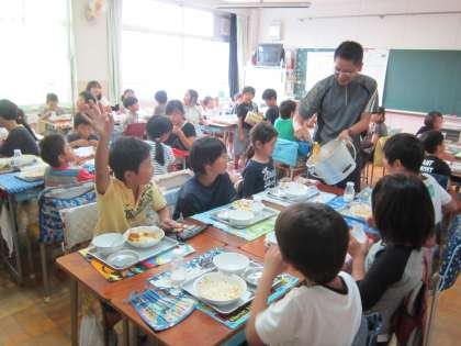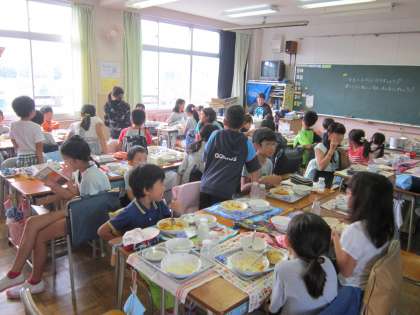 1年生から6年生までのたてわり班で給食を食べました。低学年の子は、お兄さんお姉さんと、高学年の子は、妹や弟たちと一緒に楽しく給食を食べました。休み時間も一緒に遊びました。