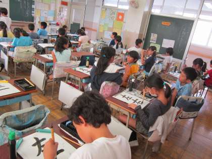4年国語科「書き方」 「左右」の書き方のポイントを教わり、集中して練習していました。
