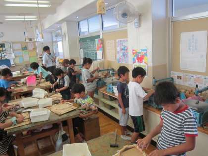 3年図画工作科「木工作 ドリームキャッチャー」 木と木のつなげ方を考えて、一人一人が夢中になって工作していました。