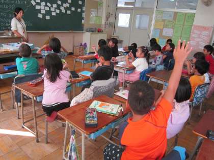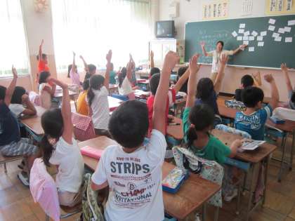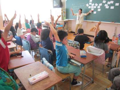 2年算数科「ひょうとグラフ」 お手伝いの人気度を表にしようという学習課題でした。一人一人の好きなお手伝いを黒板にはって、見やすくする工夫について話し合っていました。