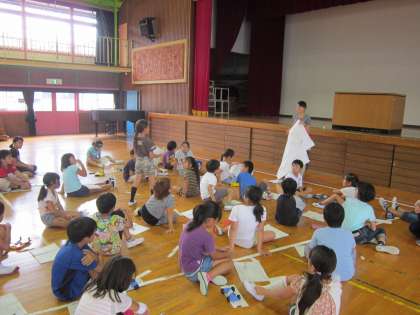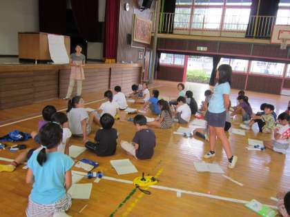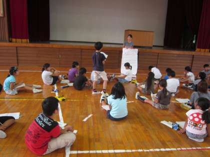 3年理科「風やゴムのはたらきを調べよう」 ゴムを伸ばした長さと車の動く距離について、予想して、実験し、結果のまとめを話し合っていました。