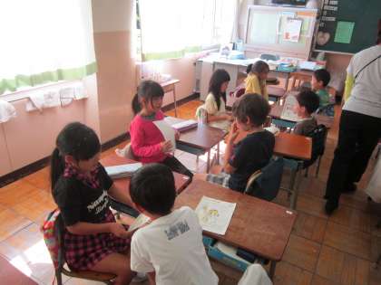 1年読書活動「よんでみてね」 自分の好きな本を友達に紹介し、聞き上手・話し上手に気を付けて対話する授業でした。