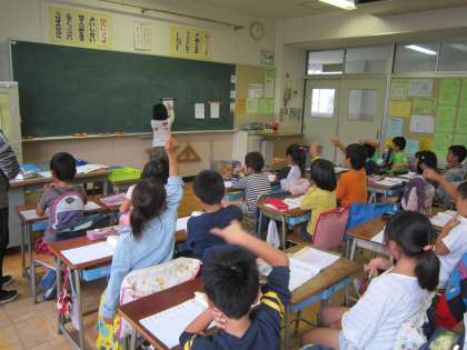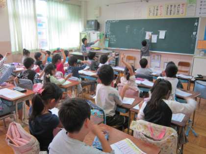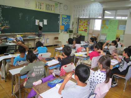 2年国語科「かさこじぞう」 新出漢字「昼」「来」の練習をしていました。書き順や使い方を覚えて、丁寧に練習していました。