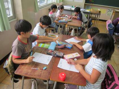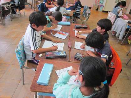 2年生活科「さつまいも」 育てて収穫したサツマイモを教室でじっくり観察していました。気づいたことをたくさん書いて、発表できました。