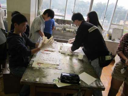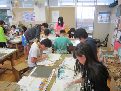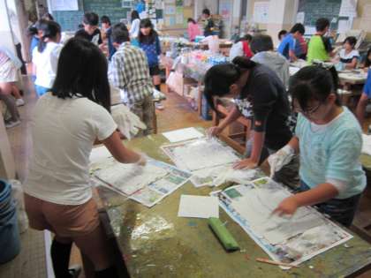 6年図画工作科「漆喰 長沼の街」 漆喰を水に混ぜて、ラスカットボードにぬって、針金などで絵を描きます。漆喰を塗る作業に一生懸命でした。