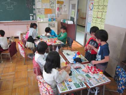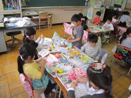 1年図画工作科「おしゃれなパペット」 今日は、持ってきたビーズなどの飾りつけをしました。楽しい作品ができそうです。